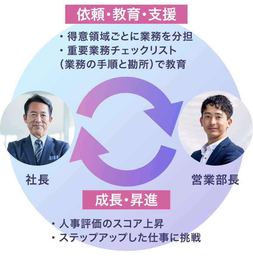 重要業務が見える化することで、社員教育が効率よく進み、マネジメント層の実務・精神的負担も軽減できます。