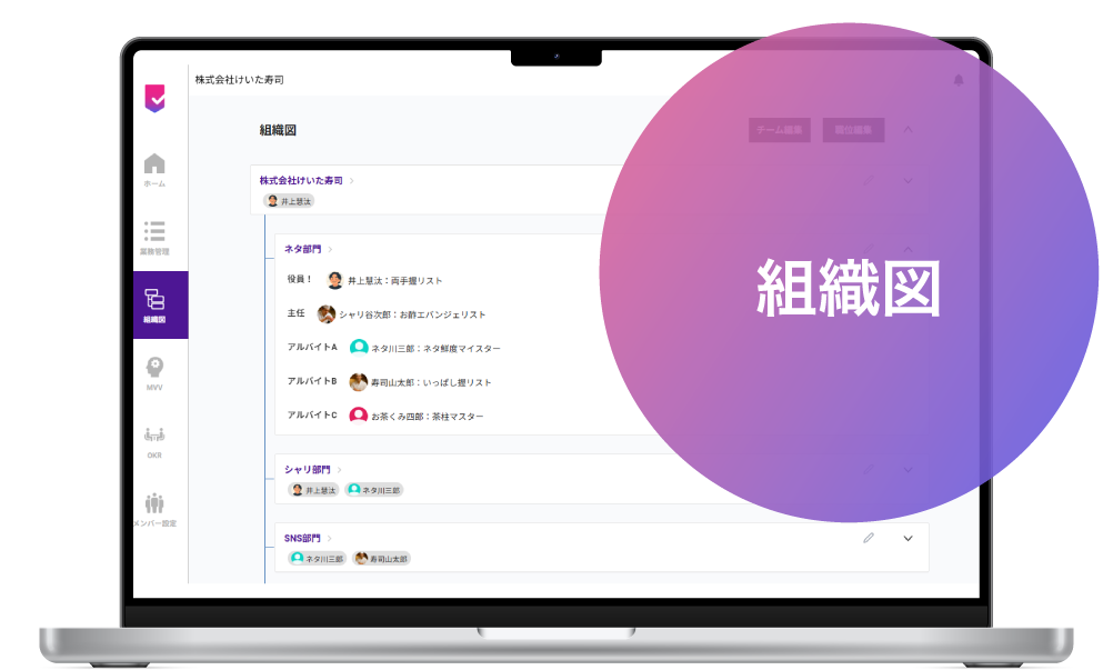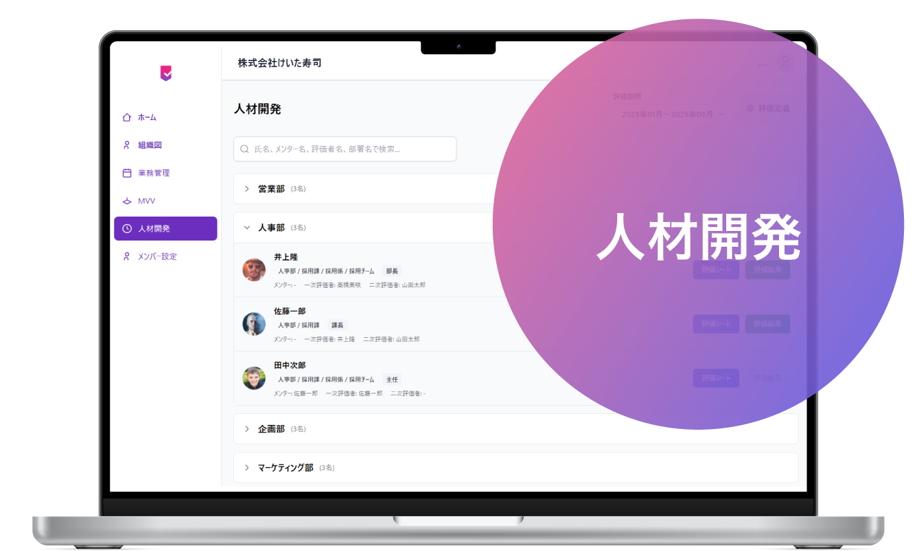さらに、理念・ビジョンから組織図、目標管理、人事評価制度、1on1までを一貫運用することで、組織の進化を加速させます。